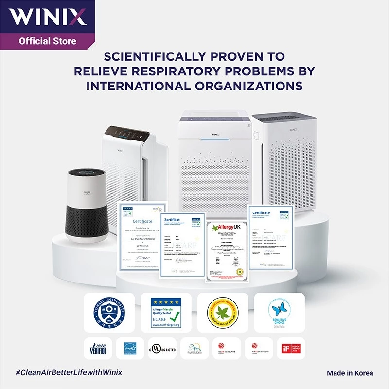 – WINIX ZERO C5 telah diuji dan disertifikasi mampu mencegah penyakit pernapasan seperti Allergy UK dan ECARF (alergi debu) dan National Asthma Council Australia (asma).